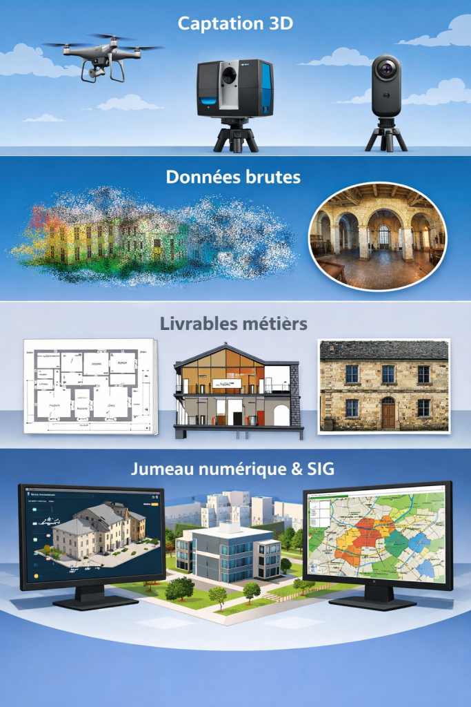 Nous portons une attention particulière à la lisibilité, à l’ergonomie et à la pérennité des livrables, pour garantir une exploitation durable, qu’elle soit technique, culturelle ou pédagogique.