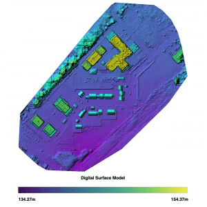 Le Modèle Numérique de Surface (ou Elevation) est une représentation de la topographie altimétrique du terrain et des structures (bâtis, végétation)